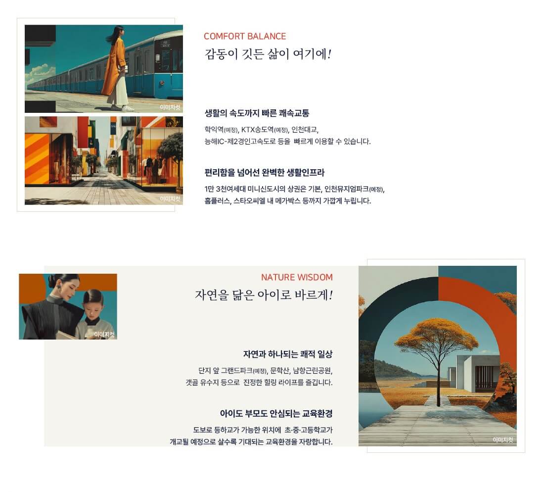 단지 바로 앞으로 초교 계획 부지가 위치해 있는 것을 필두로 반경 1km 이내에 각급 학교 예정 부지가 있습니다. 특히 시티오씨엘 8단지에서 학익역과 뮤지엄파크 등을 연결하는 문화특화가로의 경우 특화 산책로로 꾸며져 색다른 즐거움을 선사할 전망입니다.